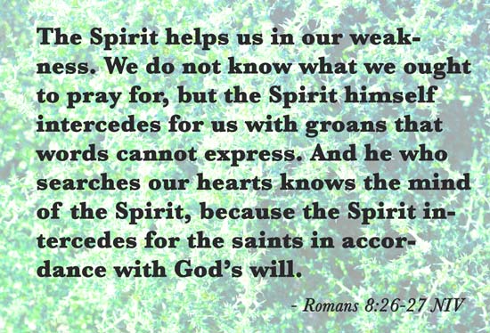 The main subject in this passage is not ourselves; it is the Spirit of God. It must be noted that the Spirit intercedes for us. Gods Spirit is not teaching us how to pray, but He is praying for us. This prayer from the Spirit often occurs without our knowledge of its happening.